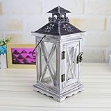 Rustic farmhouse style rustic wooden lantern crafted with pine wood distressed white treatment plus distressed metal top brass latch for stylish lantern decoration Great detailing top metal cover in tower design hollowout gives beautiful light