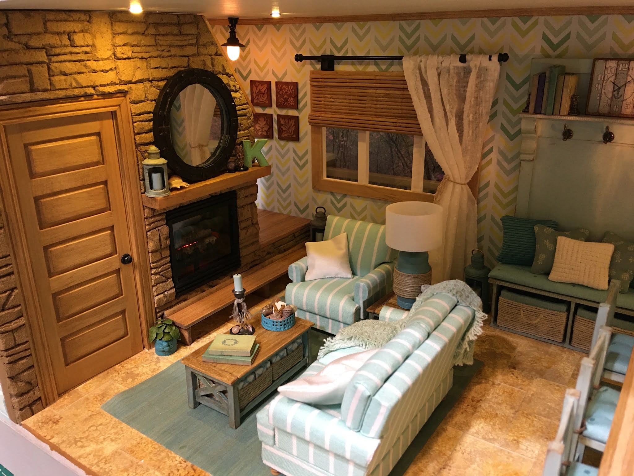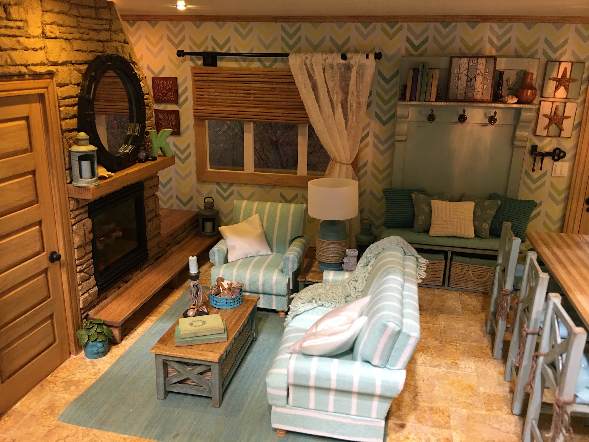 I needed to make some interesting art for the walls. I had these neat starfish saved in my stash since I first began collecting beachy things for this project. I thought it would be cute to make some plaques with a beachy, wooden fence vibe. I cut 3/8" scrap pieces into 1-1/8" lengths, painted them alternating colors, applied ink pad to the edges, mounted the starfish then sprayed a matte sealer on them.