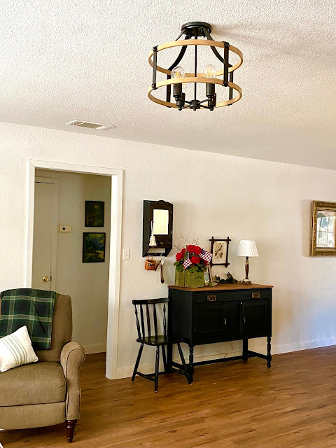Bill took it down and we donated it to the thrift store. Instead of a ceiling fan, I got the Buford Wood and Metal 4-Light Ceiling Light from Lamp's Plus. We're got a table fan instead.