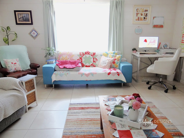 You'll notice in these photos just how bright this area is even in the afternoon, but I'm very happy with the layout now and also thrilled to have my computer desk right where the cool air of the air conditioner can find me.