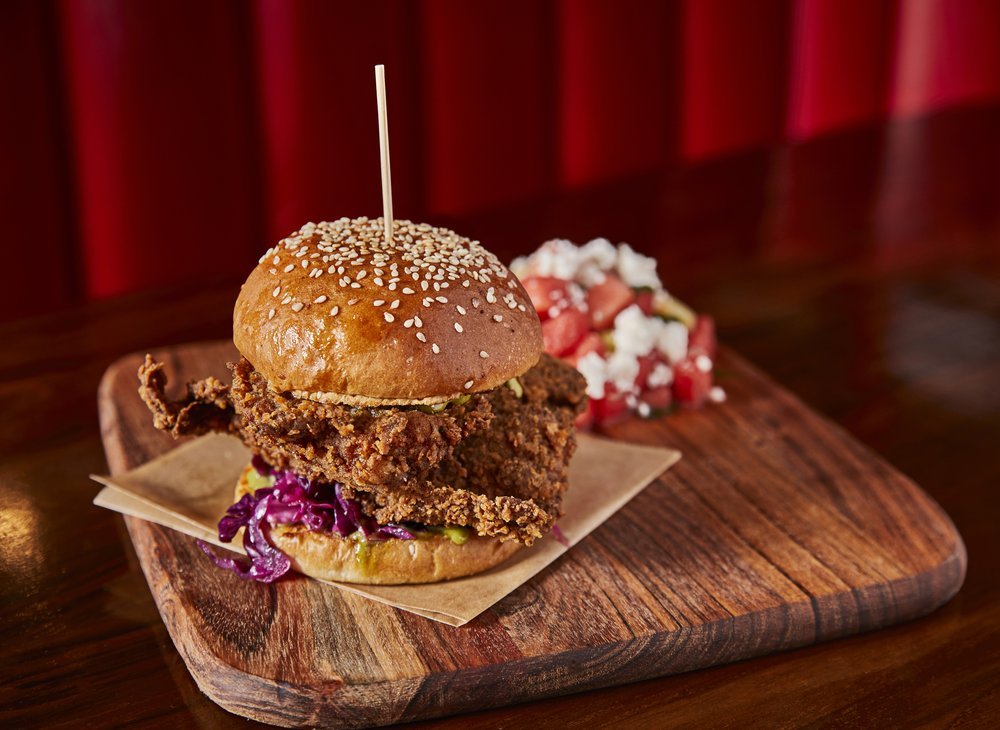 Chef Michelle Bernstein’s Michys Fried Chicken sandwich at Sweet Liberty is made with fried chicken soaked in tarragon buttermilk, and topped with cabbage fennel slaw, tarragon aioli and on a seeded brioche bun. Comes with a side of Greek watermelon salad..