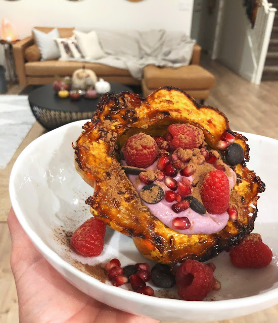 get some local sweet squash, cut in half & scoop out seeds. rub generously with vanilla bean ghee + sea salt & bake face-down on a baking sheet at 400°F until soft and caramelized. cool, then stuff with GOODS: