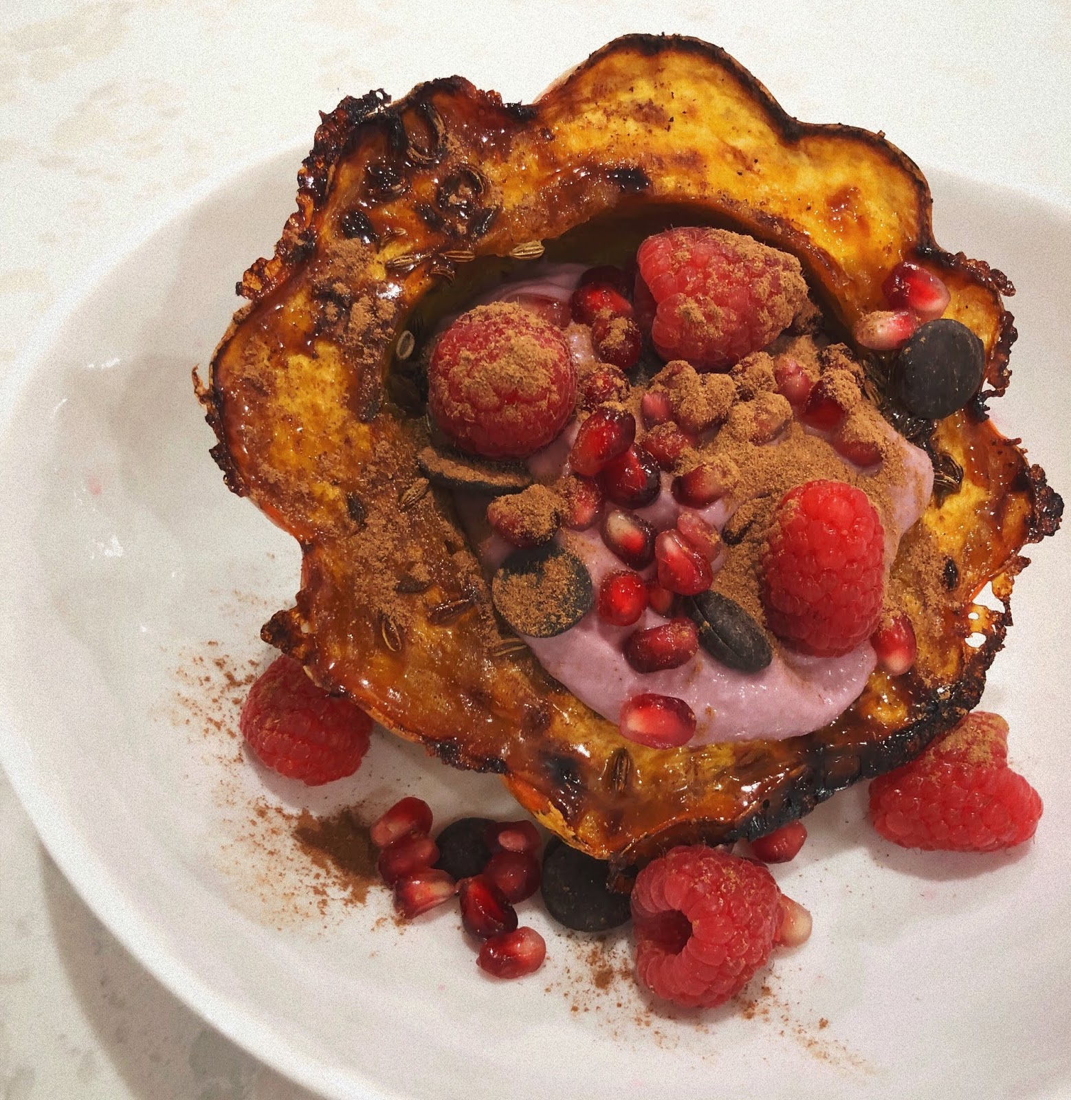 raspberry coconut yogurt, fresh raspberries, pom, raw organic 100% cacao discs, cinnamon, fennel seeds, nutmeg.